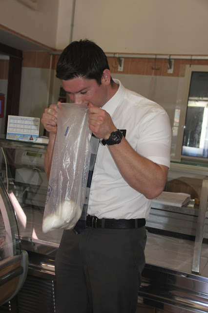 The drive to Bari and Taranto is long and tedious so a little diversion is always a good thing.  That's why we started the tradition of stopping at a water buffalo dairy to get some fresh mozarella di bufala cheese.  For the few missionaries who get to experience the event, it becomes one of their favorite memories.  The clerks at the dairy recognize us because we do the same thing every six weeks.  They graciously pose for pictures and laugh with us.